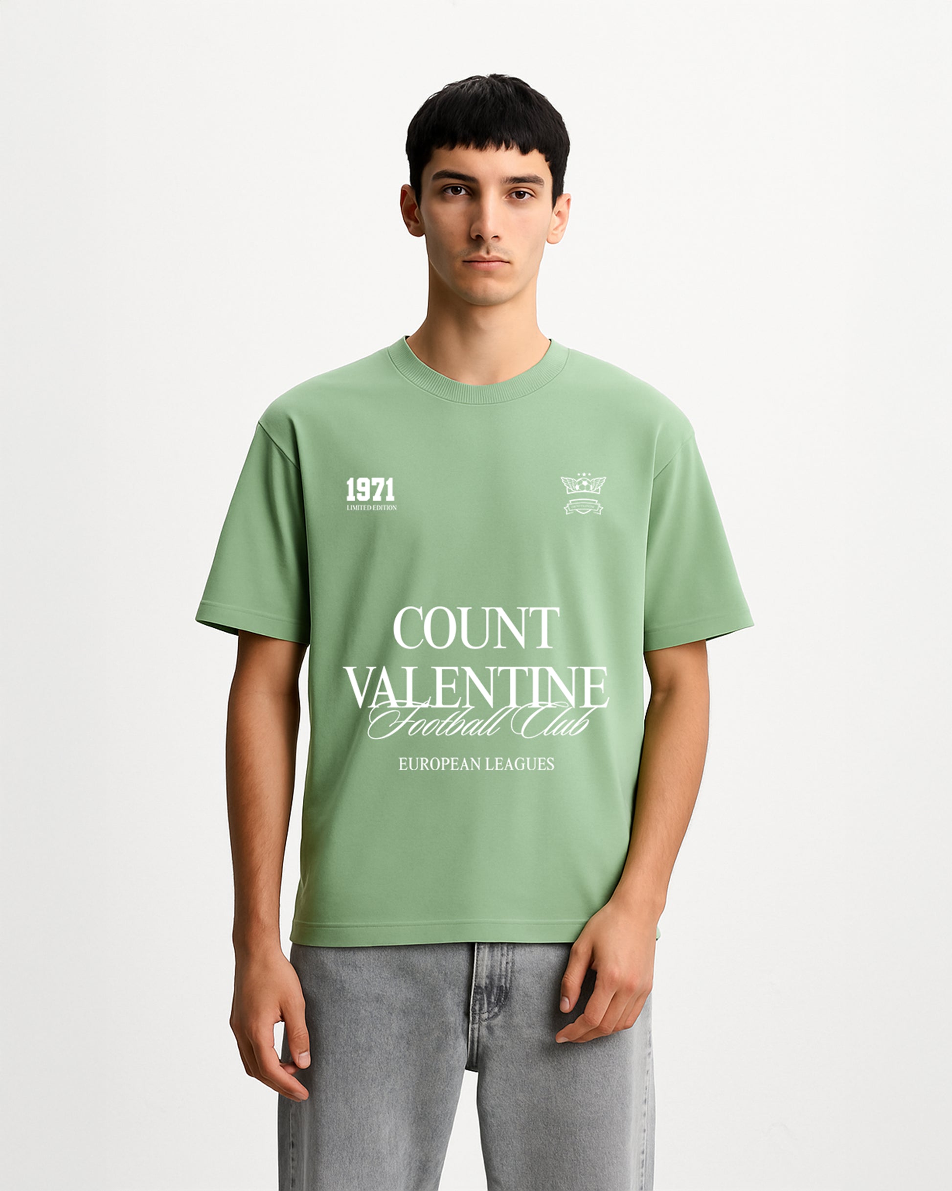 Limited edition oversized jade T-shirt crafted from heavyweight 280 GSM fabric. A fusion of vintage European football club heritage and Count Valentine’s signature high-fashion minimalism. Only a select few will own this collector’s piece.